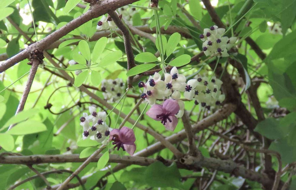白い雄花にピンク色の雌花、可愛いアケビらしい子ですね😍💜🌸