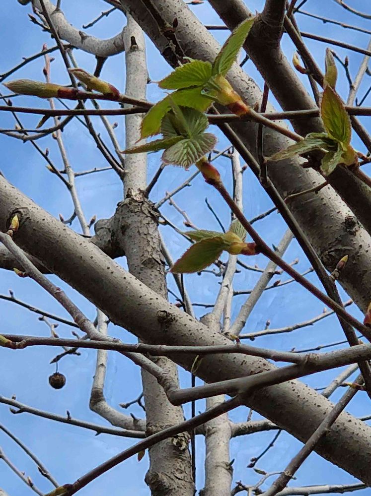 駅前ロータリーのハンカチノキに昨年の実を付けたまま新芽が出てきました。