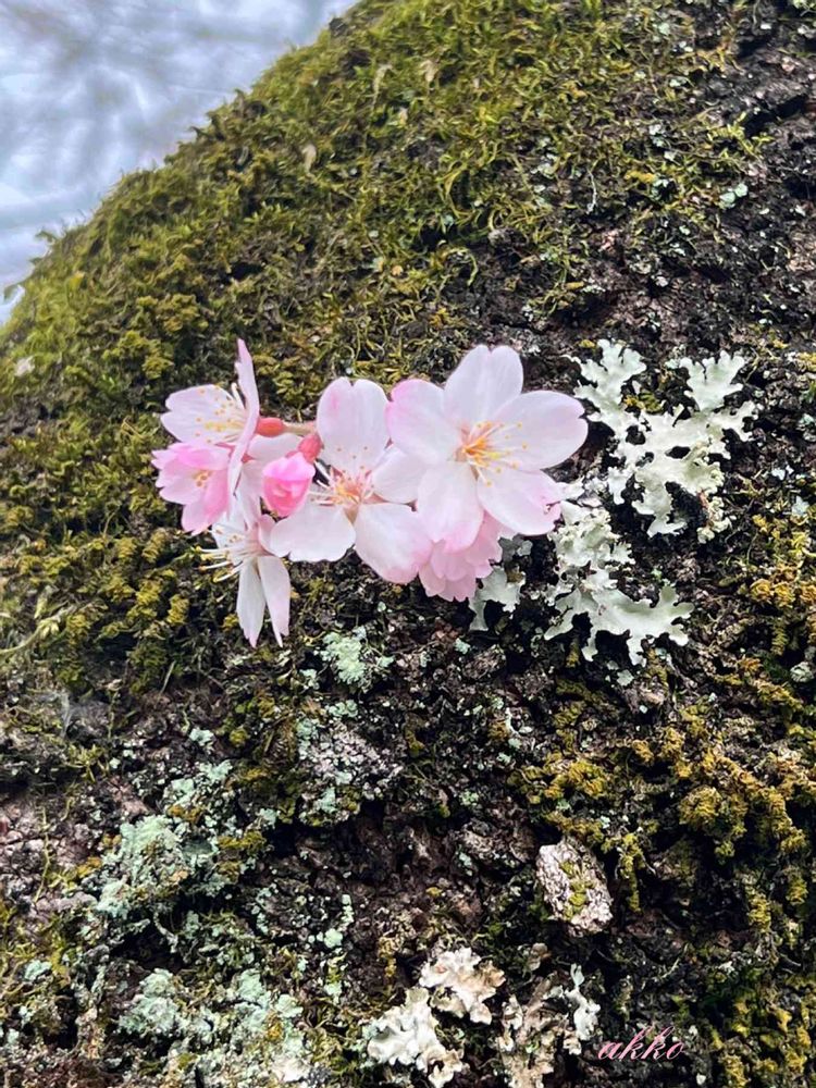 苔むした太い幹と、可愛い花びらのギャップが面白い🤣