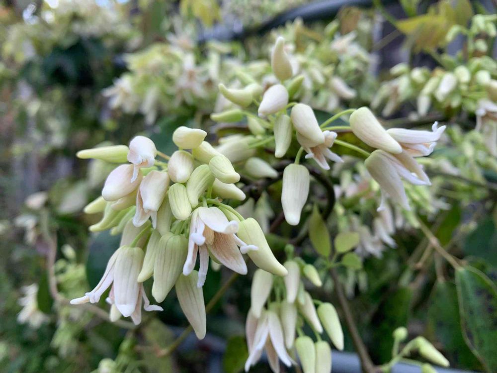 おはようございます😃お隣りさんのムベが咲いてきました😀お隣りさんから完熟の実を頂き種まきしてありますが、まだ3年目、今年もまだ咲かないかなぁ❓😅💦