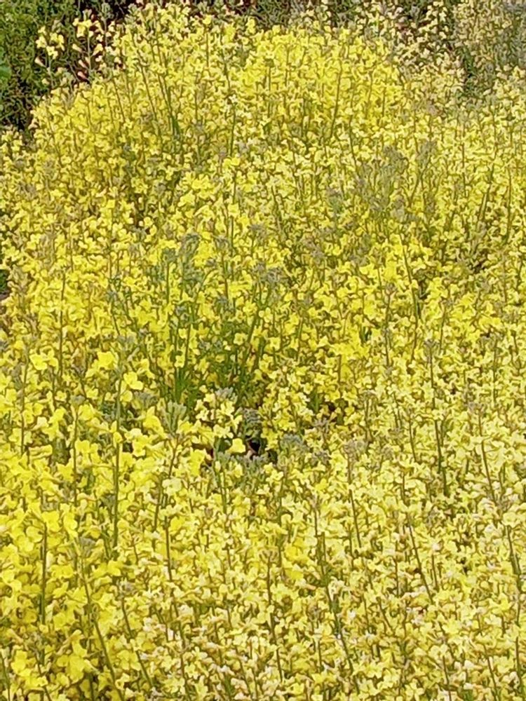 広めの畝に、2列に植えているので、あの一粒が花開きこうなります~、勿論脇芽は次々収穫するんですが、最後は追いつかなくて、菜の花より少し薄い黄色です。
