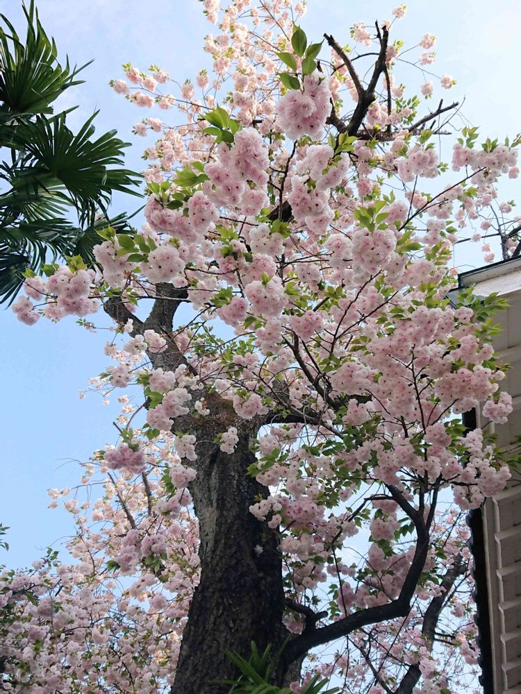 ご近所にある小さな八幡神社の八重桜がもう満開に!