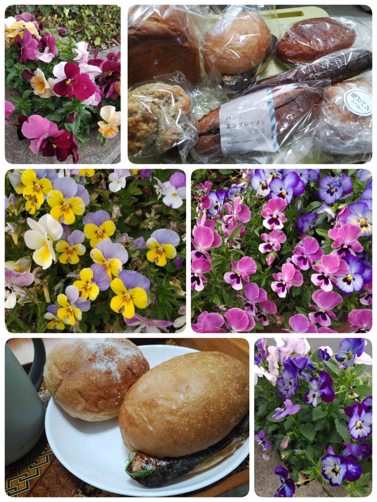 パン屋さん前の花壇にパンジーがいっぱい🥀