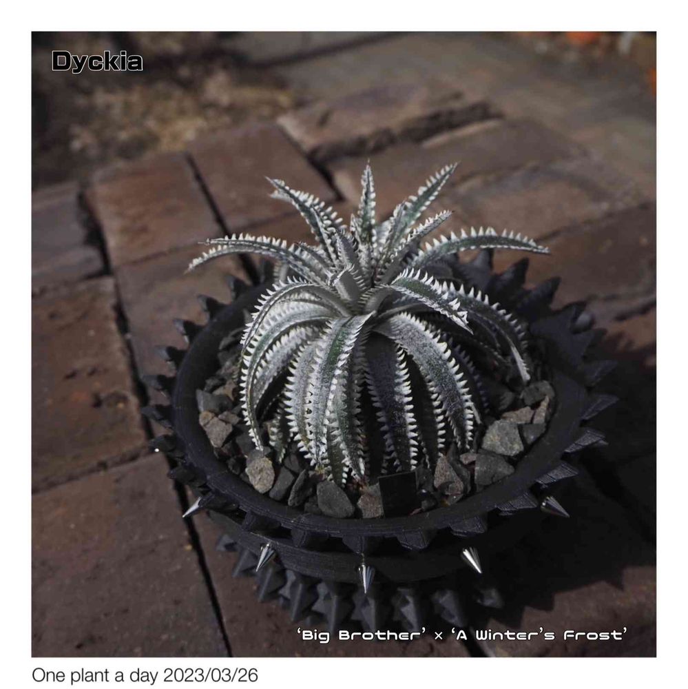 One plant a day. Dyckia ‘Big Brother’ × ‘A Winter Frost’ from @dyckiayouup_official with Rampant decks original pot from @umbrellatree.pot オリジナル鉢にとっておきのディッキアを植え付けました😉昨年Spikesでお迎えして、植え替えせずに冬越し。流石に少し伸びてしまいましたが、展示会でも人気の株なので、植え替えて展示会仕様に🥰土がたっぷり入るように作ってもらった鉢は、予想以上に使いやすく、独特なデザインも相まって迫力のセッティングになりました😏 販売用にひとつストックがあるのですが、自分で使っちゃいそう😅 オリジナルなので、鉢に名前をつけさせてもらいました。聳え立つ城壁の要塞のような迫力のデザインから、【Rampant】にしました🥰オープンガーデンで販売予定です😏