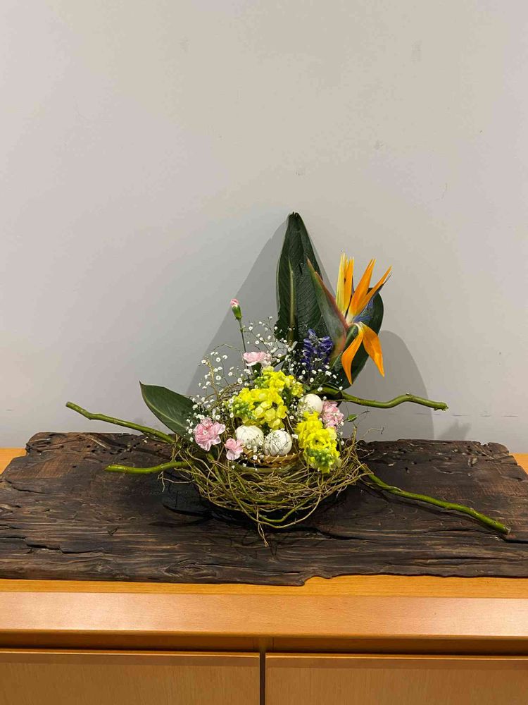 『巣立ち』・・・年度始まりにあたり、新しい旅立ちをと思い、鳥の巣に卵と卵から孵ったヒナを表現してみました。
