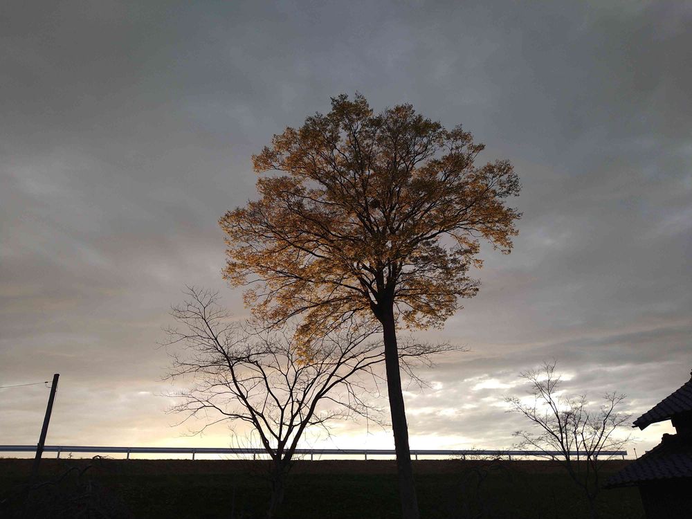 今朝、新聞を取りに玄関の戸を開けたら朝陽に照らされてわが家のケヤキがオレンジ色に染められていました😆✌️
