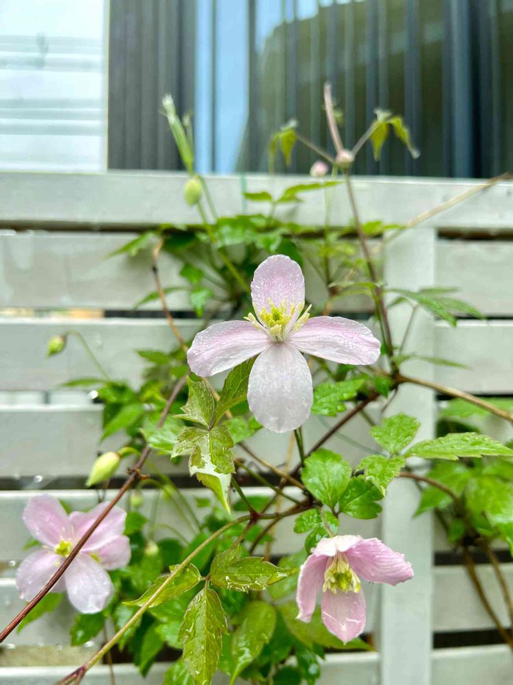 シェードガーデンの奥にあるクレマチスモンタナちゃん咲いてくれてます♡甘くていい匂いだけど雨だし 高くて嗅げない💦