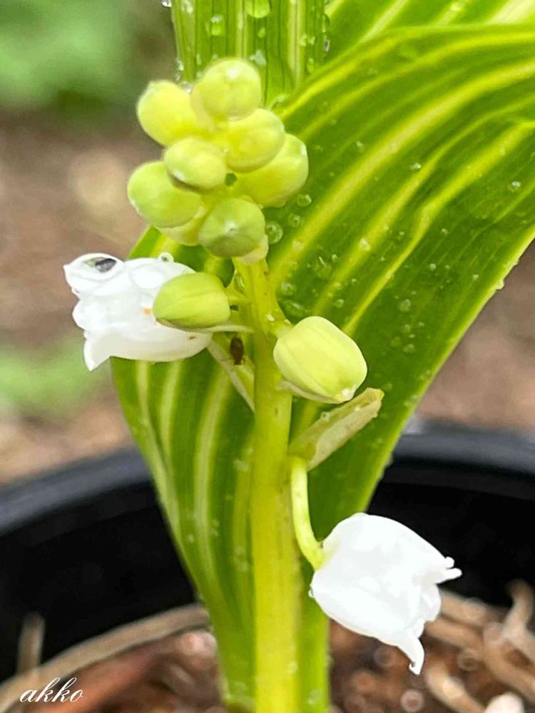 雨の中、珍しい縞模様の葉の下で、鈴蘭が咲きました🤍