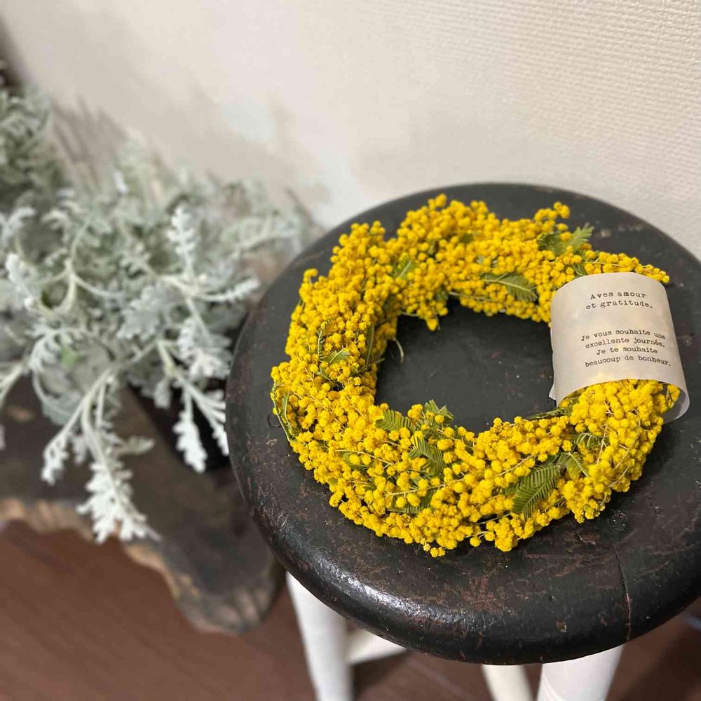 これは、フレッシュなミモザでリースを作った後に、紙でケーキ型みたいな輪っかを作って、その中に入れておきました。
