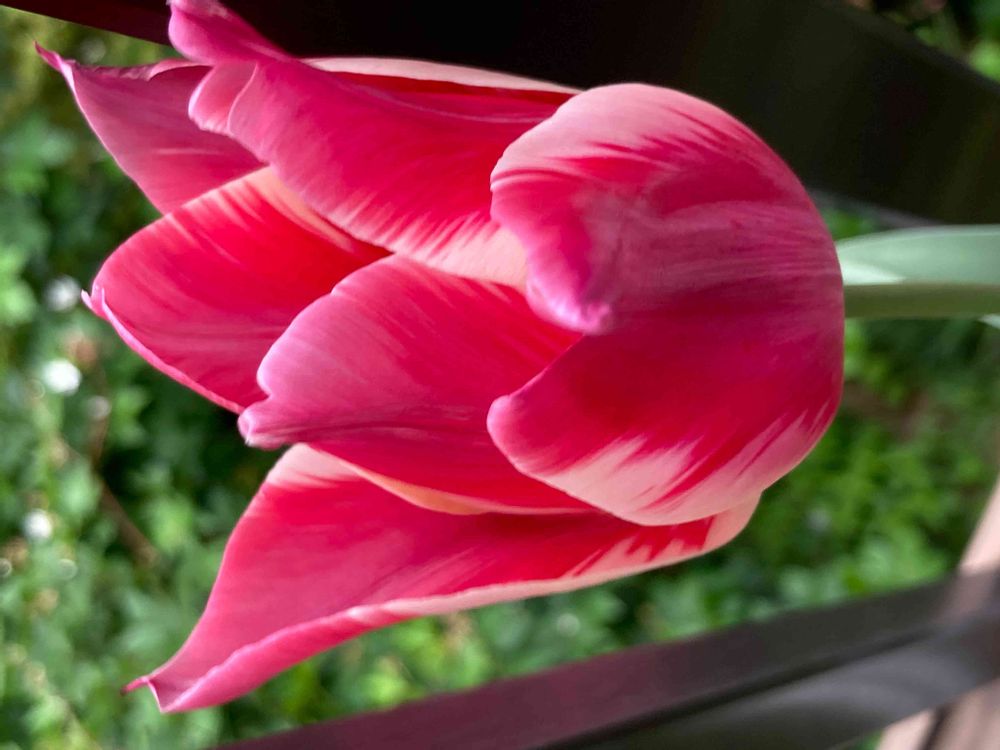 こんばんは😊チューリップ🌷放ったらかしガーデンにて。秋植え球根から新色開花‼️めっちゃ美人系、植えた記憶?皆さま佳き週末をお過ごしくださいね👍😃🎶