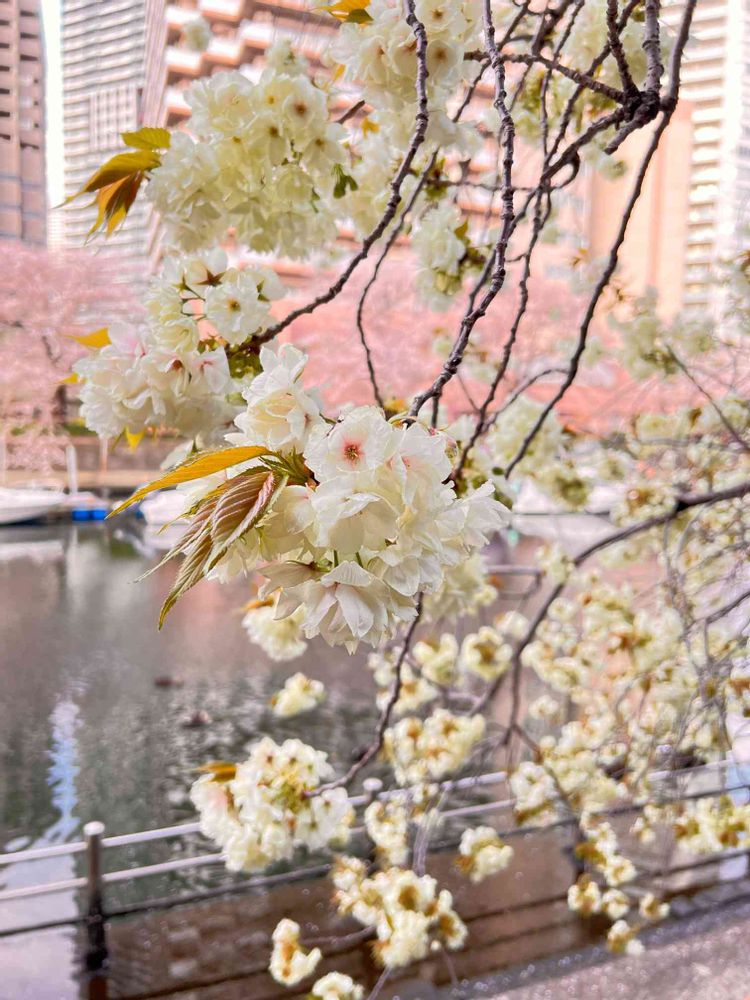 月島、隅田川沿いのウコン桜、黄緑色の花びらが印象的です😳