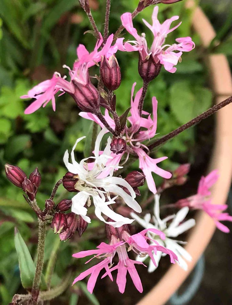 リクニス、ピンクロビンとホワイトロビンが、同じ鉢の中で、咲きました。嬉しい😃です。