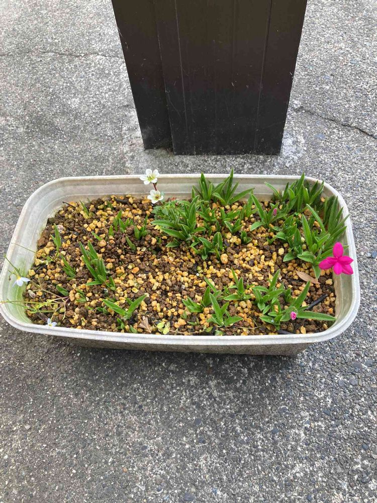 お手入れでもげたクモマグサとヒナ草とメカルドニアが同居してます。