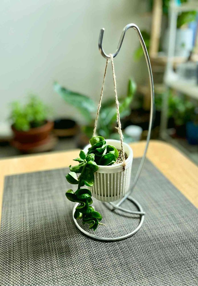 今日の花、ウチのホヤ・カルノーサ・コンパクタです♪花咲かすにはまだまだですがネジネジして愛嬌たっぷり😊バナナスタンドにも見事にフィットして、お気に入りの1つです✨