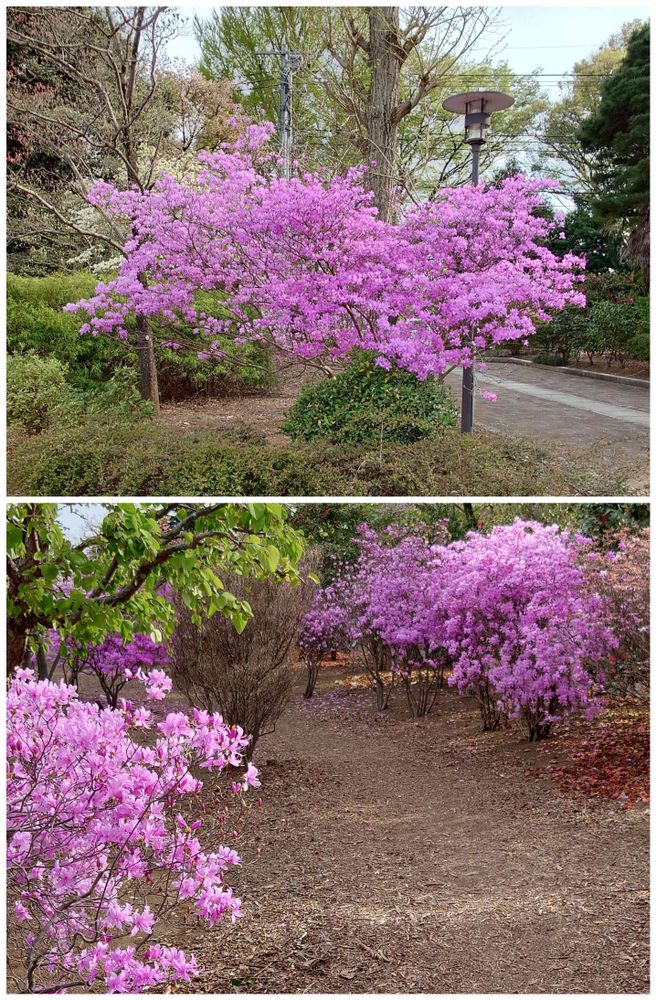 いま咲きほこる花たちのなかでも、ツツジの鮮やかさは抜きんでています💃(農業試験場内にて)