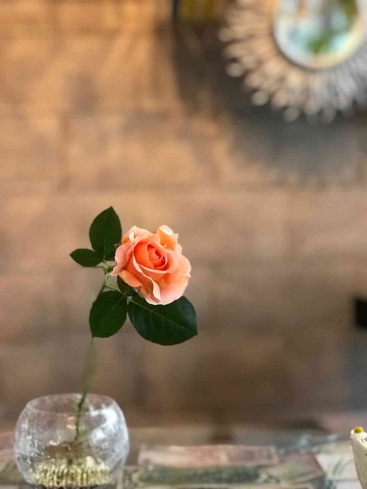 さっきのピンクローズを摘んで、さしてみた。