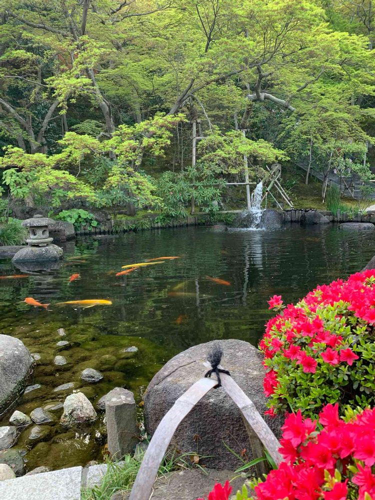 真っ赤なツツジが手前に見えて奥の池の鯉が泳いでいる様子が風流です。