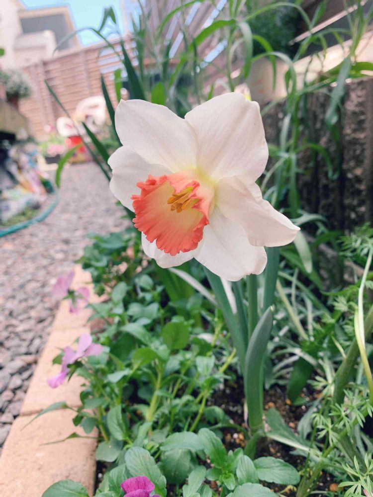 小さな庭,カップ咲き水仙 白に桃花種,ガーデニング初心者の投稿画像