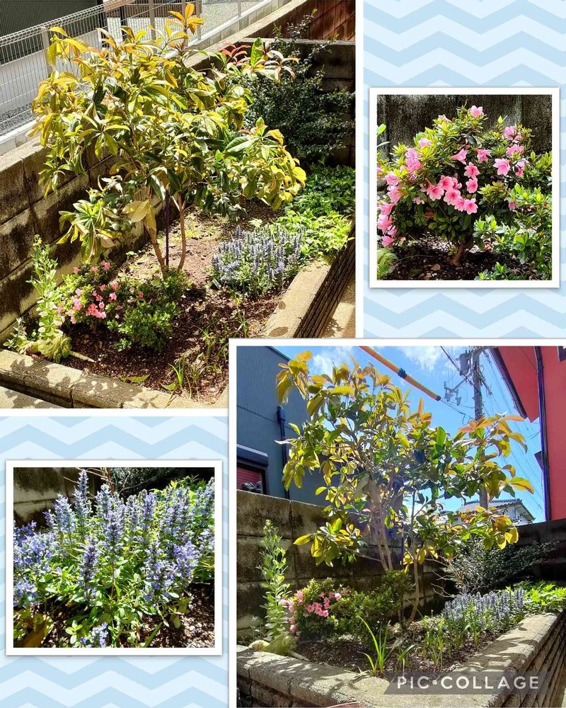 キンモクセイの木陰で、アジュガと久留米ツツジの花が咲いてます🌸✨