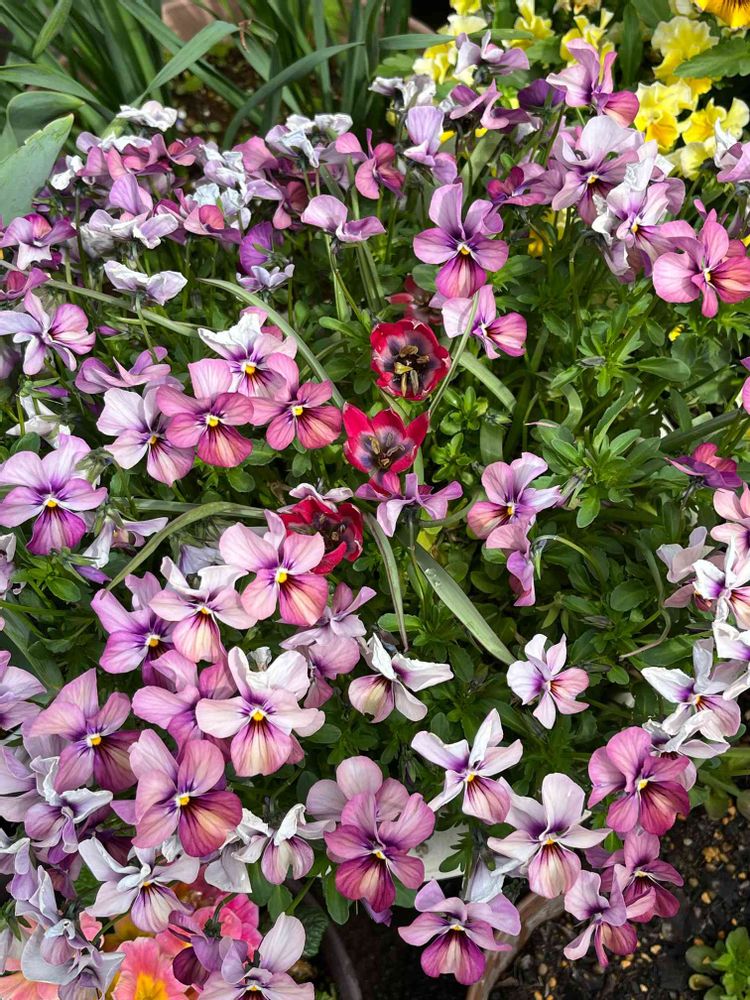昨年のプランターに零れ種で咲いたビオラ、中央にチューリップ🌷が咲きました。