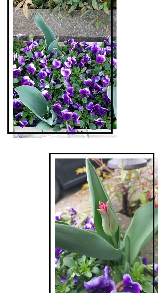 ビオラさんと仲良しさんのチューリップ🌷やっと顔出した🤭葉っぱがでかいからどうなるんと思っていたらもう蕾が出たよ💕いつ咲いてもいいよ❣️今日になりました(笑) 修正済