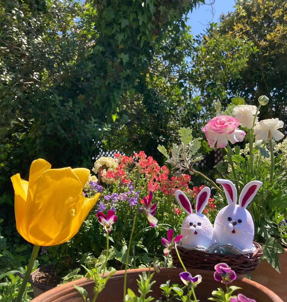 春のお庭でイースターを楽しんでますね。🌷🌼🥰
