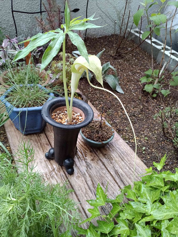 ウラシマソウ、珍しいから購入したのですが、奇妙な姿で怖さもあります。お庭で似てる葉を発見したご主人様にもビックリです。山野草、ご近所さんから譲り受けているうちに魅了されています。夏越しがんばらねば。