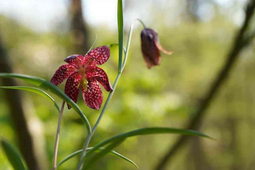 フリチラリア・メレアグリス。バイモの仲間で、釣鐘型の花全体に、赤紫色の市松模様のような網目が入っています。