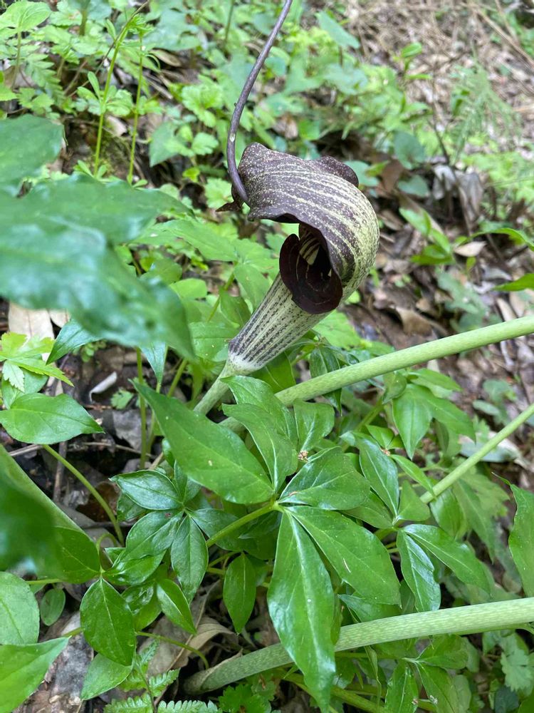 マムシグサと間違えそうですが、調べたら 浦島草は地面の上に咲き、長い髭のようなものを持っていて、マムシグサは茎を長く伸ばした先に花?が咲くそうです。