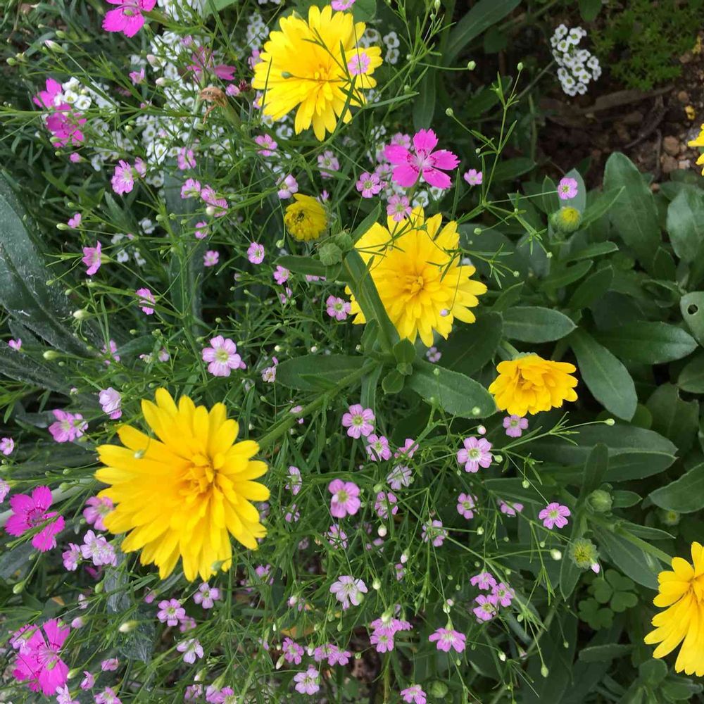 こぼれ種で出てきたかすみ草やなでしこ?なんだかんだとカラフルに😅