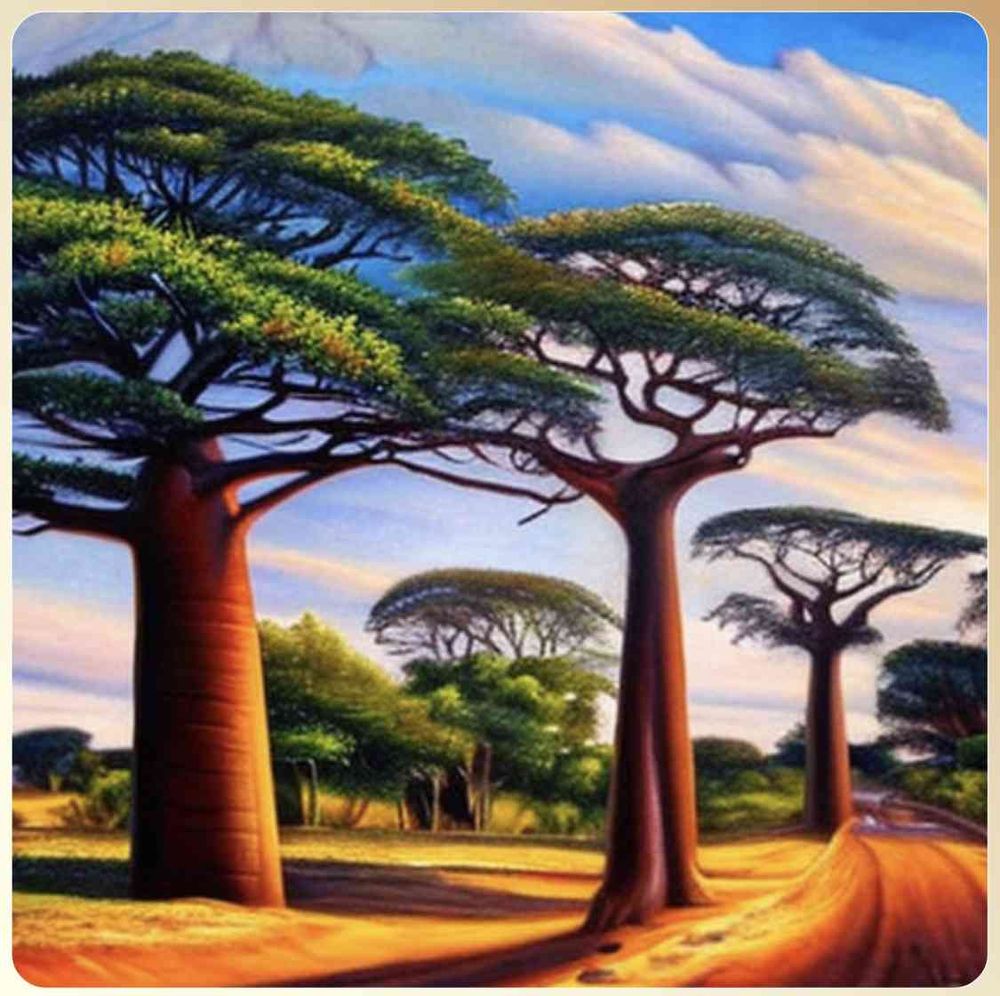 10K,高品質,写実的,油絵, 風景画 , リアル, 神秘的,バオバブの並木道, 日没前の時間帯の光景,マダガスカルの絶景