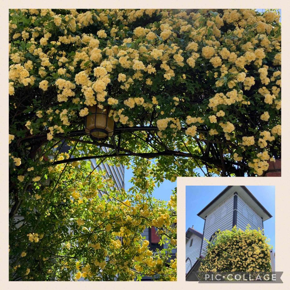 教会⛪️のアーチにモッコウバラの鶴が張って有り!最高に素敵な風景ですね😊👍