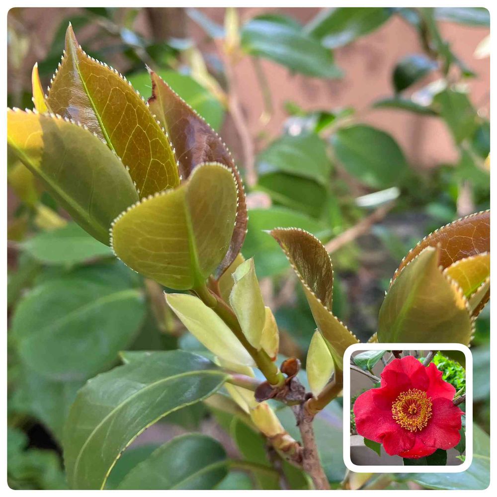 picは椿【光明】のピカピカの新芽です。