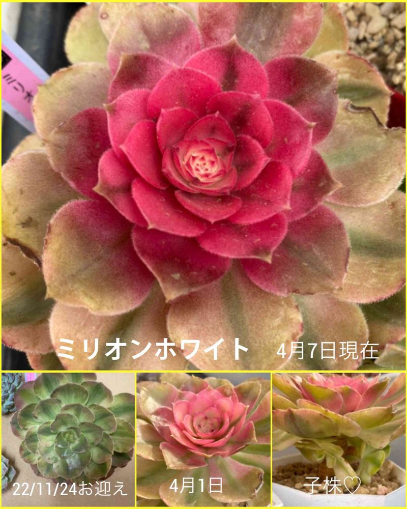 写真下はお迎え時と今月1日の姿、子株も出て少しずつ成長してます🎵