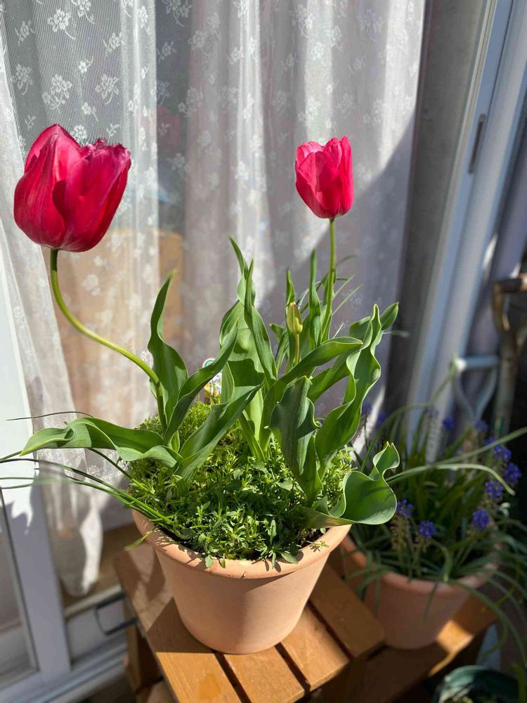 一夜明け、もりもりビオラを切り戻した後の葉っぱとチューリップ🌷 1ヶ月後くらいにまたもりもりになってくれるかなぁ?