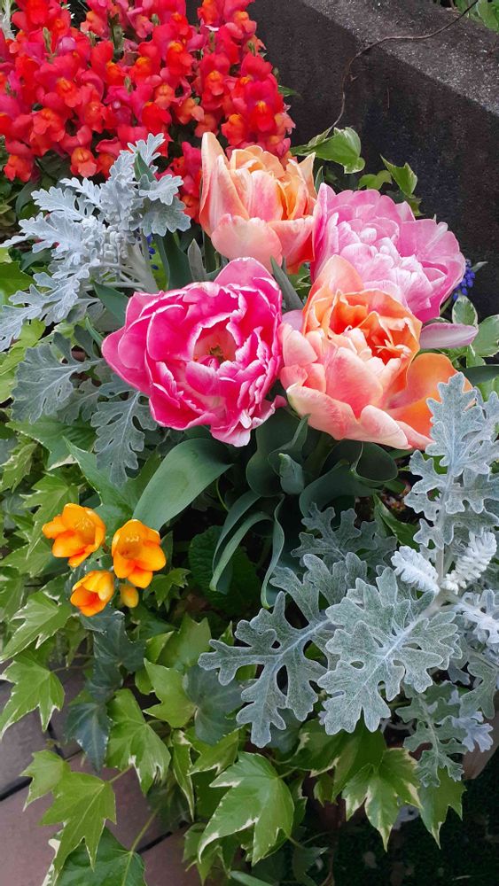 花束植えのチューリップ🌷のそばに植えたはずのないフリージアが咲いてきました🤔😅💕