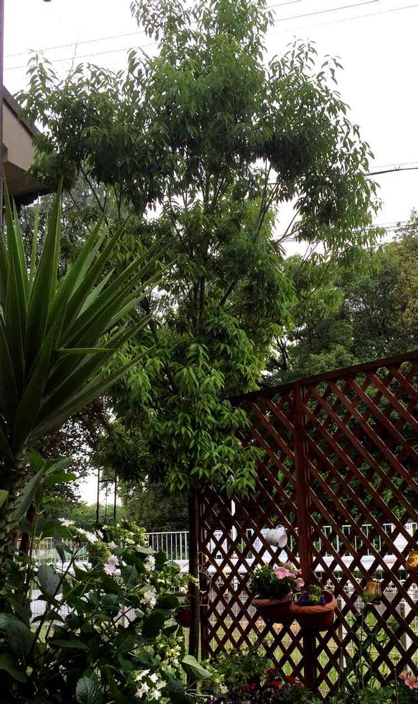 子供達が小さい頃、公園でひらってきたどんぐりを植えて…12年くらいかな。まっすぐ綺麗に伸びて、こんな背高に。思い出のどんぐり。