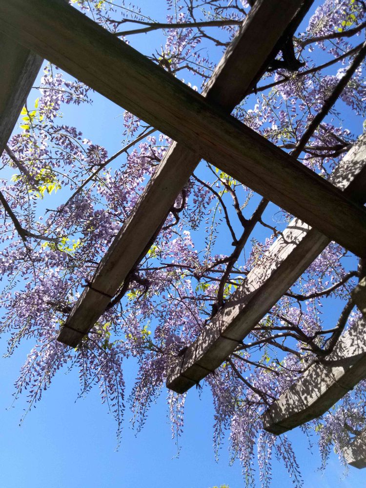 晴天の青空に、咲きかけた藤ノ花が映えていました。