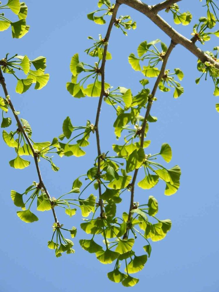 周辺を散歩の途中見た❗青空とコラボしてイキイキと伸びだした🌱イチョウの若葉🌿