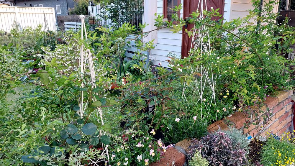 このレンガのレイズドベッドの植物たちを半分くらい入れ替えて薔薇を主にしました🎵