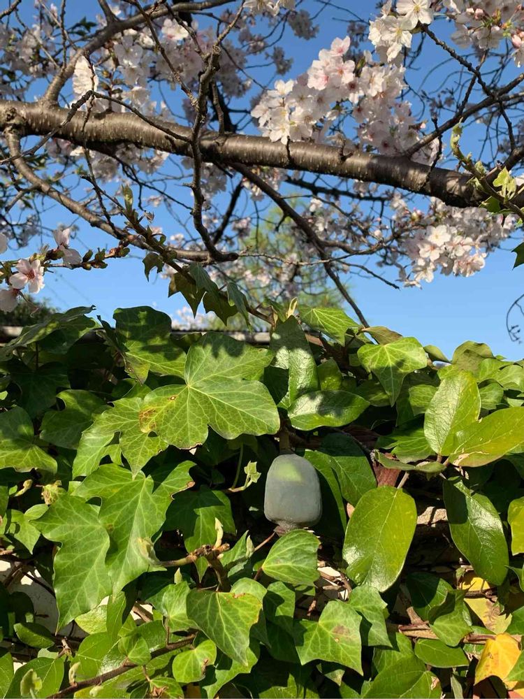 塀の上の桜を眺めていたら、アイビーらしい蔦と一緒に別の蔦がありました。