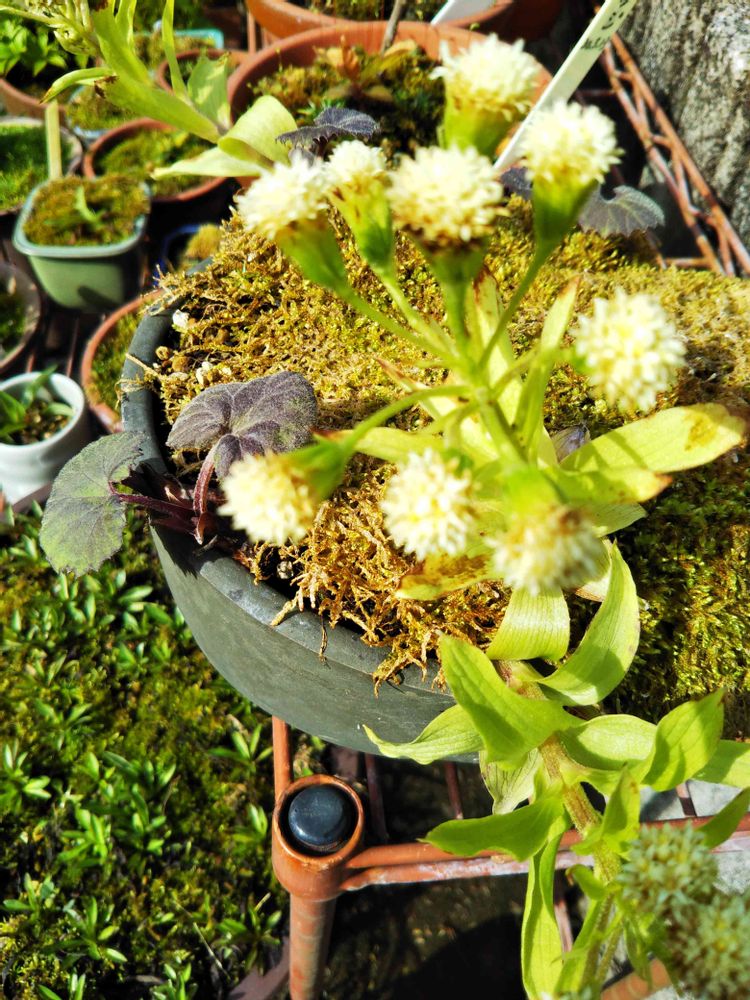 <地道投稿・自宅採取投稿>鉢の「フキノトウ」咲き終わり「フキ」が出てきました。窮屈ですが我慢してください。左下は「尾瀬水菊」こちらは数倍に増えてきました。