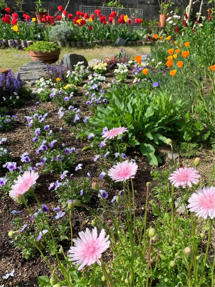 種まきっ子一年草や、チューリップが満開です。