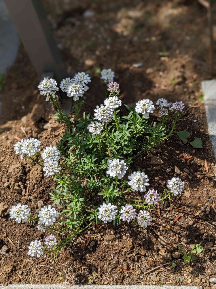 白いイベリスにピンクの花が咲き出した