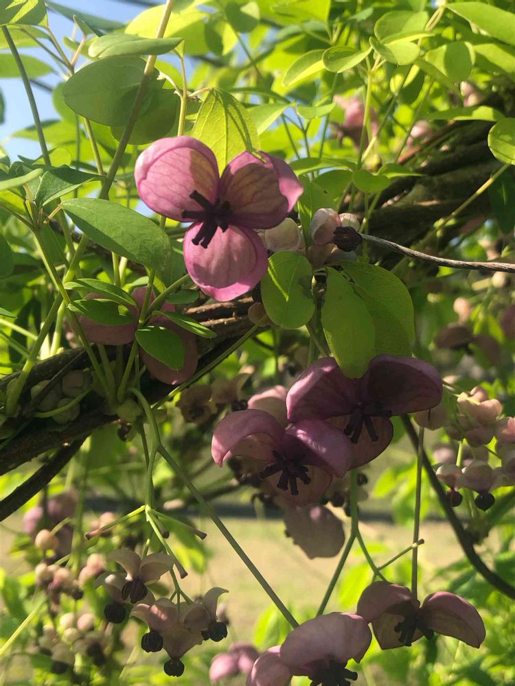 ゴヨウアケビに出会いました 暗紫色の花が美しい❣️左下が雄花でしょうか 雌雄同株 でも実が付きにくいとか