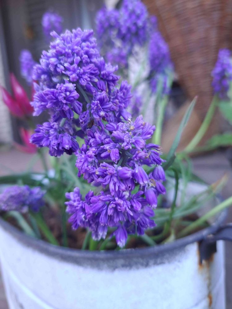 八重咲きかと思いましたが、よーく見ると、普通のムスカリはひとつの花茎からちっちゃいお花が1つですが、これは10個くらい、ぎゅ~っと集まって咲いてます。