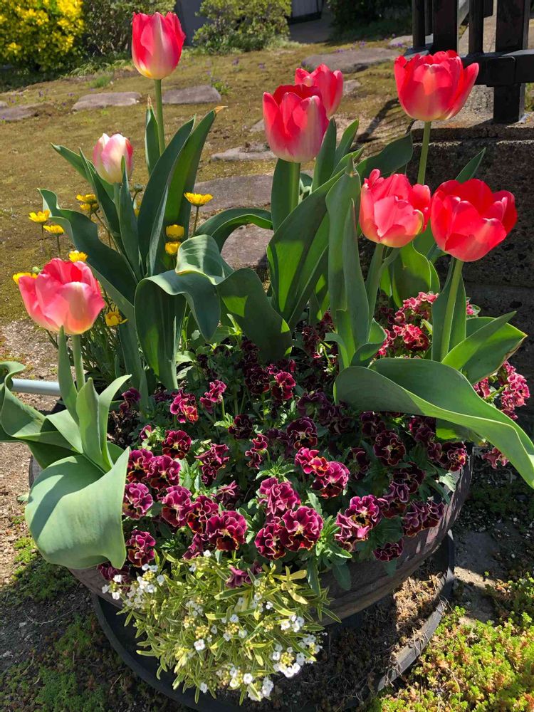 今年はチューリップ🌷ながく咲きました フリル咲きビオラミルフルもモリモリ◎手前挿木ひと枝で命つなげたスーパーアリッサム 少し遅れて元気なムルチコーレ🌼