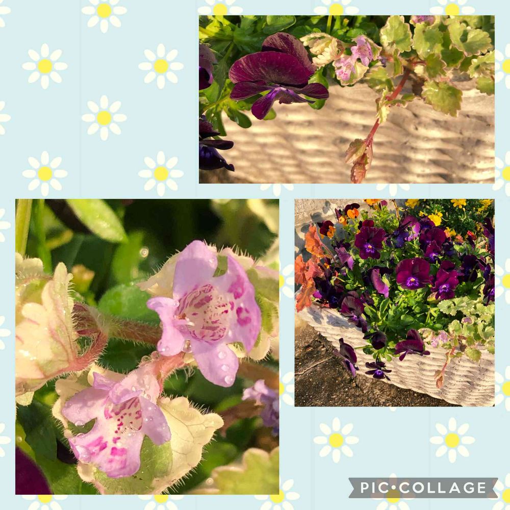 シックに組み合わせたつもりのビオラ達もモリモリしてた頃からは落ち着いたけれど、その分、グレコマのお花💜がさりげなくて、可愛い😍💕