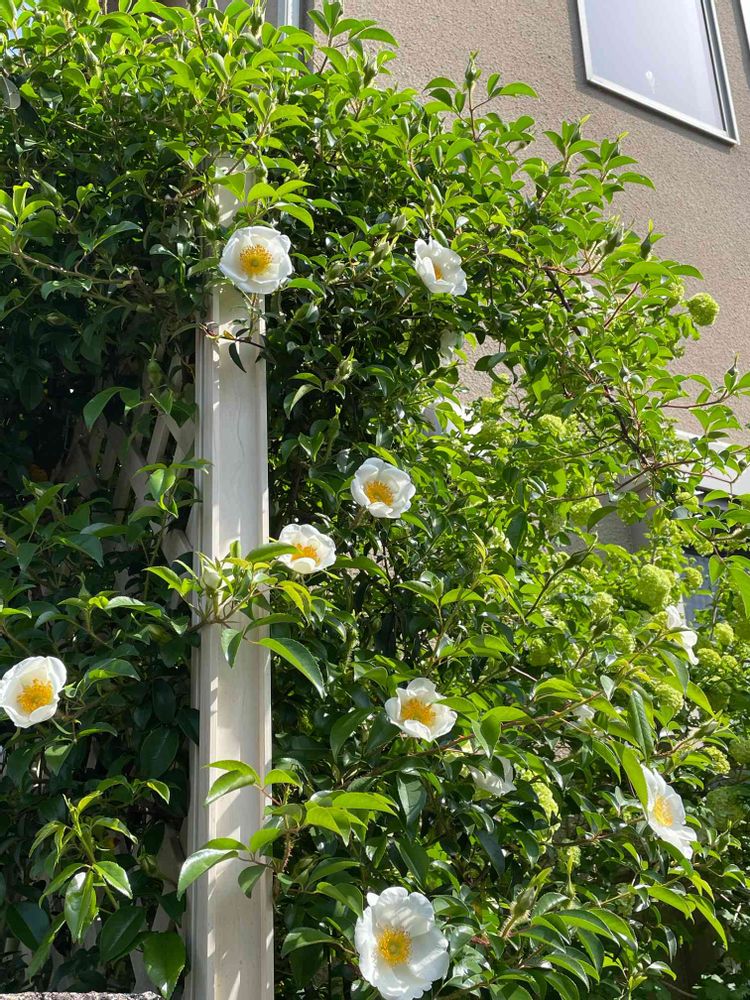 このラティスいっぱいに真っ白なナニワイバラが咲きます💓