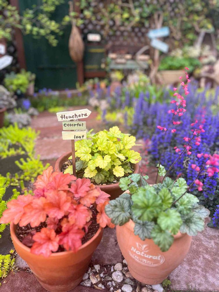 他の花に気を取られている間にヒューケラたちが冬の眠りから芽覚め綺麗に変身してました💚💛🧡